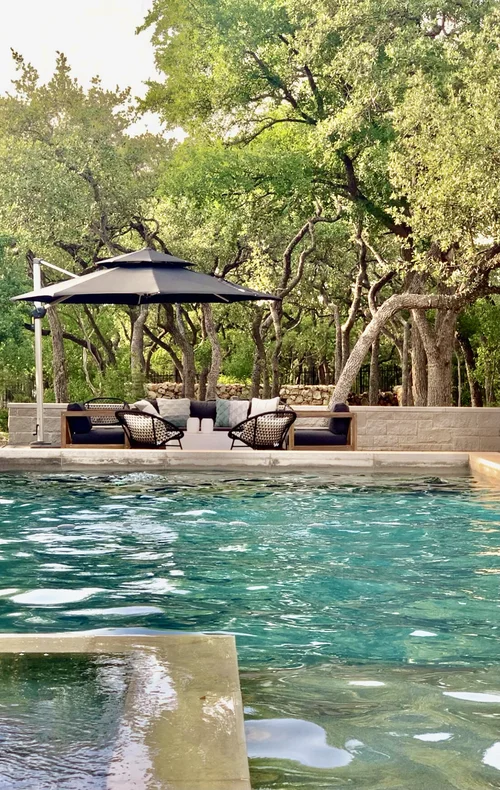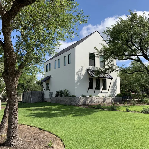 SET IN THE TEXAS HILL COUNTRY, SIMPLE FORMS ARE LINKED WITH GLASS ELEMENTS TO CREATE A HOME THAT IS CONTEMPORARY YET RESPONDS TO ITS ENVIRONMENT. THE DESIGN IS SITE DRIVEN, PRESERVING TREES AND OPEN LAND BY MINIMIZING ITS FOOTPRINT WHILE TAKING ADVANTAGE OF THE SHAPE AND ORIENTATION OF THE LOT.