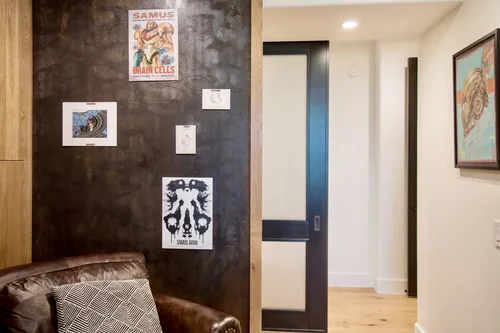 SITTING AT THE CORNER BETWEEN A RESIDENTIAL AREA AND A COMMERCIAL STREET, THIS HOUSE MARRIES THE CHARACTERISTICS OF EACH ZONE. USE OF RECLAIMED AND RECYCLED MATERIALS REINFORCES THE INDUSTRIAL FEEL OF THE NEIGHBORHOOD, WHILE THE FORMS RELATE TO THE NEIGHBORING HOMES.